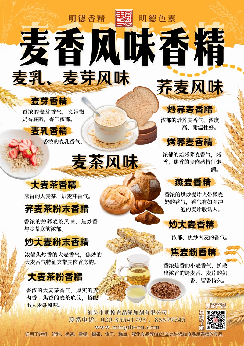明德麥香風(fēng)味香精 谷物焙香 層次飽滿汕頭市明德食品添加劑有限公司推出的麥香風(fēng)味香精系列,覆蓋麥乳、麥芽、蕎麥、大麥茶、燕麥、小麥粉等多種谷物調(diào)性。產(chǎn)品風(fēng)味真實(shí)、層次清晰,留香穩(wěn)定,適用于飲料、雪糕、糖果、烘焙與休閑零食等B端應(yīng)用,幫助工廠快速打造具有記憶點(diǎn)的麥香風(fēng)味。